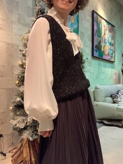 ボウタイブラウスとのコーディネートは “正統派” を感じさせますが、、、